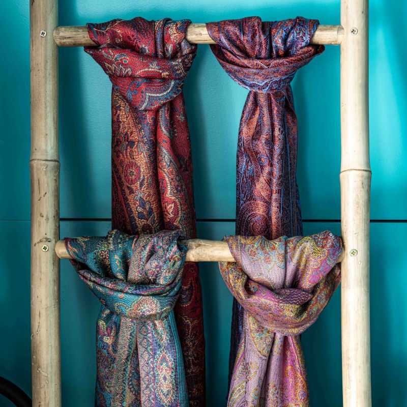 Wechselndes Sortiment an gemusterten und einfarbigen Schals aus Seide, Paschmina/Seide, Alpaka, Wolle, Baumwolle oder Viskose